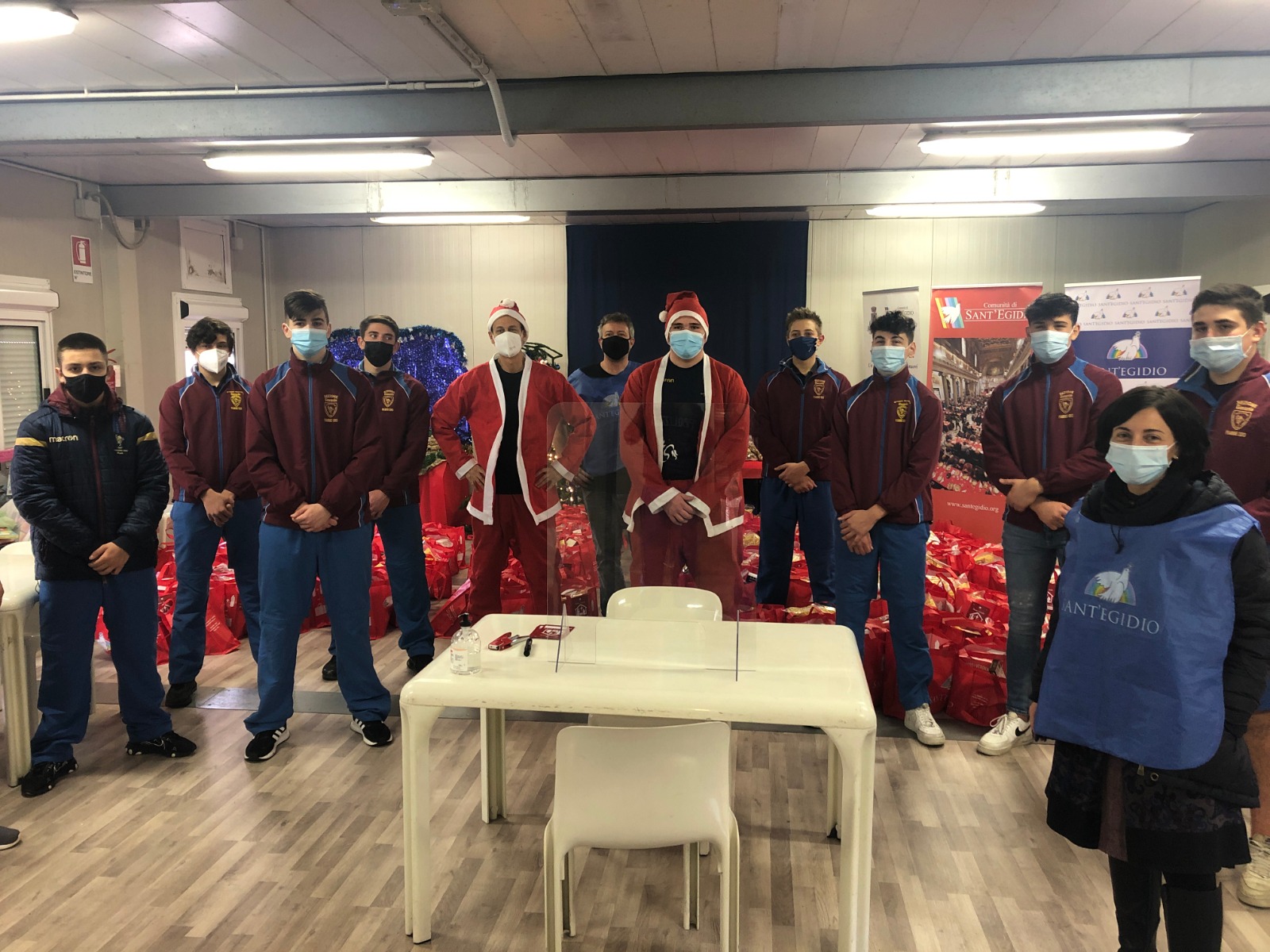 Oltre sessanta ragazzi dei settori giovanili cremisi Under 16 e Under 18, insieme ai loro coach, hanno partecipato oggi, dalle 14,30 fino a sera inoltrata, alla distribuzione di pacchi contenenti generi alimentari a circa 150 famiglie presso la sede di Fiumicino della Comunità di Sant’Egidio, in via delle Spigole 5.