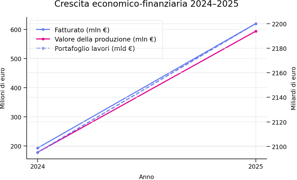 Il Consorzio Eteria chiude il 2025 con un portafoglio lavori che raggiunge i 2,2 miliardi di euro, con una maggiorazione del 5% rispetto al 2024. Il fatturato, a oggi, supera i 620 milioni di euro con un risultato più che triplicato rispetto al 2024.  Inoltre, nei primi mesi del 2026 Il Consorzio si è aggiudicato altre tre assegnazioni di grande valore economico e simbolico: il Ponte dei Congressi di Roma, la SS2106 Jonica, e la Linea 10 della metropolitana di Napoli, per un valore complessivo pari a 616 milioni. Eteria è un consorzio senza scopo di lucro, il cui obiettivo è offrire un vantaggio concreto alle imprese associate attraverso la collaborazione nella gestione degli appalti. Per questo motivo, il bilancio 2025 si chiude in pareggio: i costi sostenuti dalla società vengono ripartiti tra i soci in proporzione alla loro quota, al netto degli eventuali ricavi.