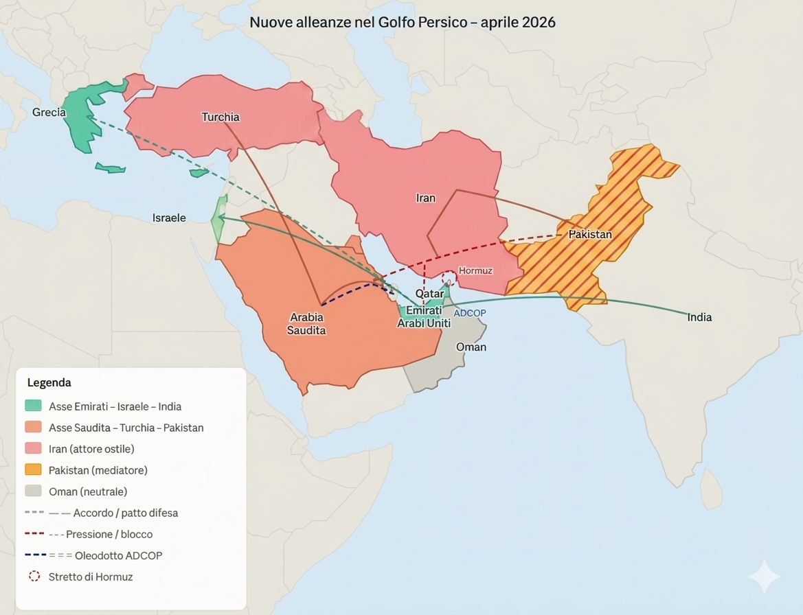 Dall’altro lato si consolida un asse alternativo, che ha la sua spina dorsale nel rapporto tra Arabia Saudita, Turchia e Pakistan. Riad e Islamabad hanno firmato nel settembre 2025 un accordo di difesa reciproca che prevede che un’aggressione a uno dei due Paesi sia considerata un’aggressione a entrambi, una logica di mutua difesa che ricorda l’articolo 5 della NATO. Il Pakistan, mediatore nei negoziati tra Washington e Teheran, si trova in una posizione delicata ma centrale. Ankara, dal canto suo, ha intensificato i legami con Doha e con Riad, alimentando quello che alcuni analisti già definiscono una sorta di “NATO islamica” informale, che integra la deterrenza nucleare pakistana, la potenza finanziaria saudita e la proiezione militare turca.